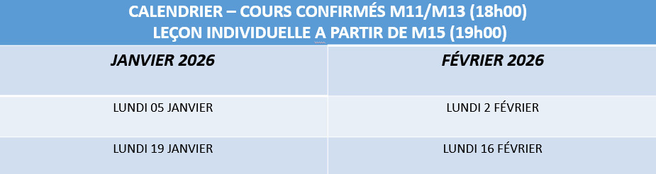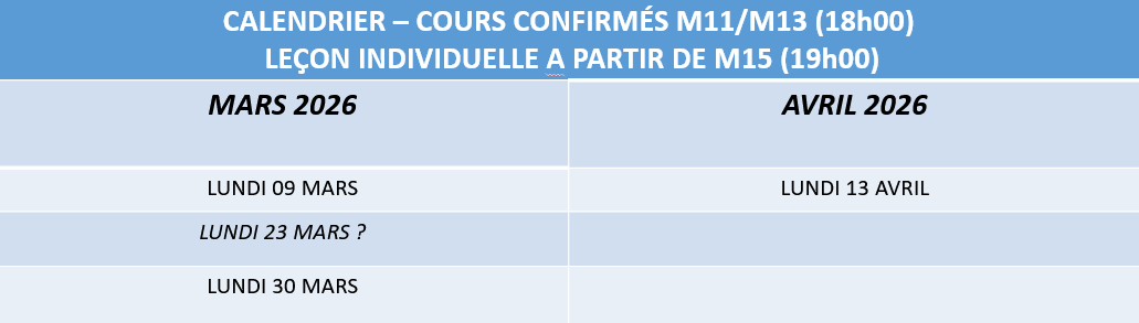 Le lundi soir de 18h à 19h pour les enfants (confirmés jusquà M13) et de 19h à 21h (à partir de M15), selon calendrier (voir ci-dessous).